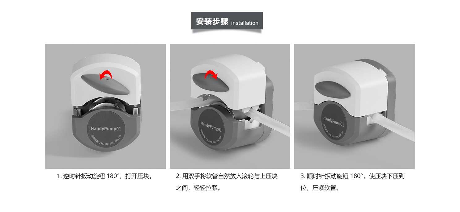 HandyPump系列速裝型蠕動(dòng)泵泵頭 搭配42-60步進(jìn)電機(jī) 體積小巧 前置旋鈕開啟上壓塊 節(jié)省操作空間 可較快更換軟管 具有自適應(yīng)卡管裝置 單通道\雙通道任意選擇 適用5種不同尺寸的軟管